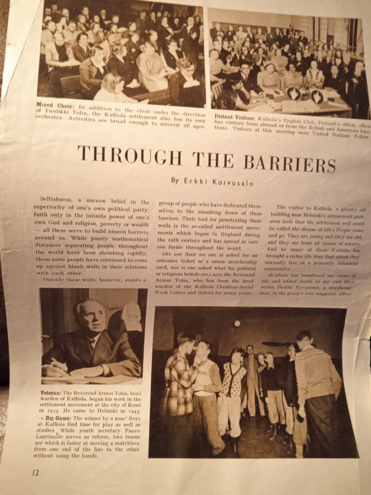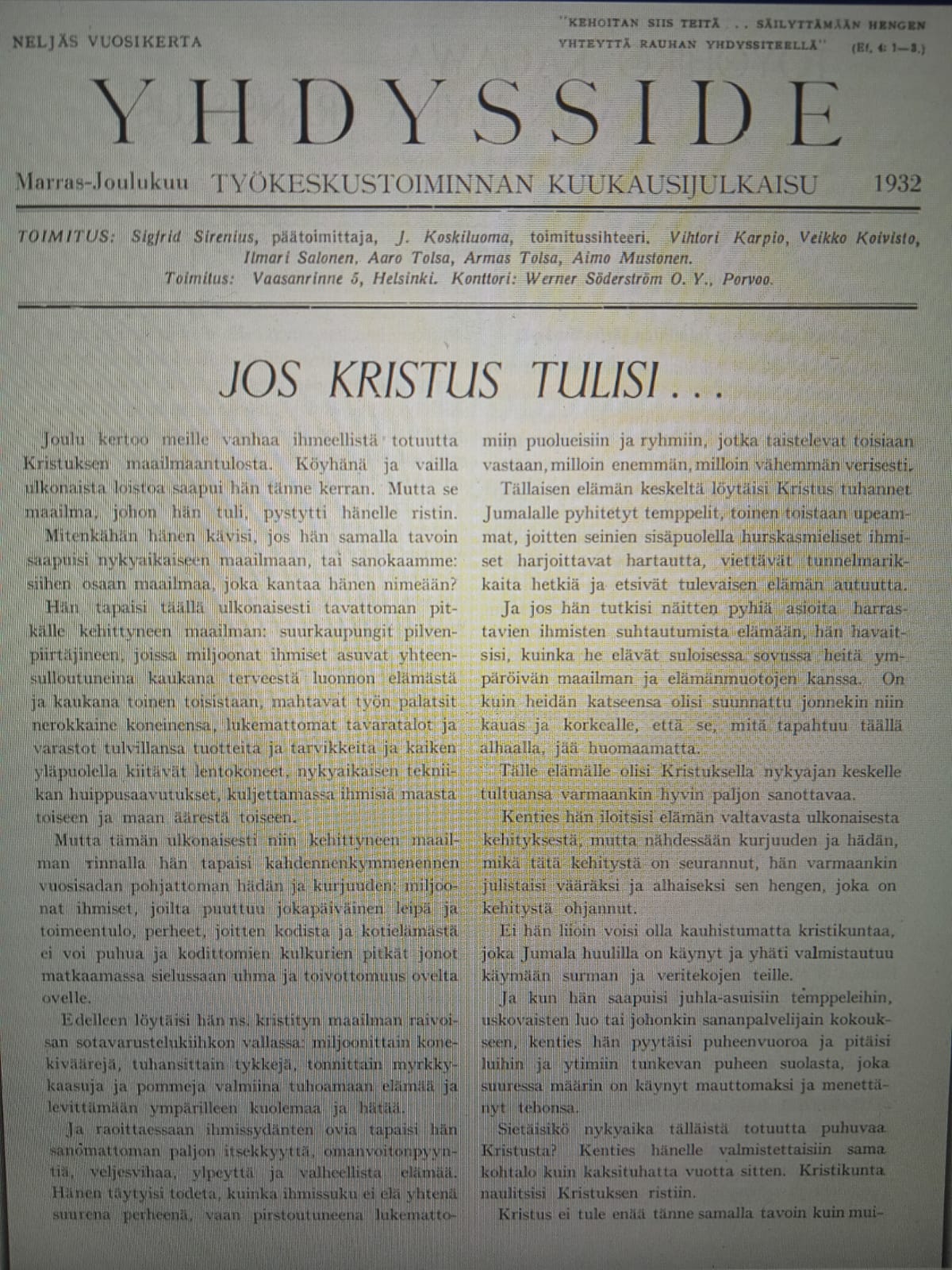 "Jos Kristus tulisi...Joulu kertoo meille vanhaa ihmeellistä totuutta Kristuksen maailmaantulosta. Köyhänä ja vailla ulkonaista loistoa saapui hän tänne kerran. Mutta se maailma, johon hän tuli, pystytti hänelle ristin. Mitenkähän hänen kävisi, jos hän samalla tavoin saapuisi nykyaikaiseen maailmaan, tai sanokaamme: siihen osaan maailmaa, joka kantaa hänen nimeään? Hän tapaisi täällä ulkonaisesti tavattoman pitkälle kehittyneen maailman: suurkaupungit pilvenpiirtäjineen, joissa miljoonat ihmiset asuvat yhteensulloutuneina kaukana terveestä luonnon elämästä ja kaukana toinen toisistaan, mahtavat työn palatsit nerokkaine koneinensa, lukemattomat tavaratalot ja varastot tulvillansa tuotteita ja tarvikkeita ja kaiken yläpuolella kiitävät lentokoneet, nykyaikaisen tekniikan huippusaavutukset, kuljettamassa ihmisiä maasta toiseen ja maan äärestä toiseen. Mutta tämän ulkonaisesti niin kehittyneen maailman rinnalla hän tapaisi kahdennenkymmenennen vuosisadan pohjattoman hädän ja kurjuuden: miljoonat ihmiset, joilta puuttuu jokapäiväinen leipä ja toimeentulo, perheet, joitten kodista ja kotielämästä ei voi puhua ja kodittomien kulkurien pitkät jonot matkaamassa sielussaan uhma ja toivottomuus ovelta ovelle. Edelleen löytäisi hän ns. kristityn maailman raivoisan sotavarustelukiihkon vallassa: miljoonittain konekiväärejä, tuhansittain tykkejä, tonnittain myrkkykaasuja ja pommeja valmiina tuhoamaan elämää ja levittämään ympärilleen kuolemaa ja hätää. Ja raoittaessaan ihmissydänten ovia tapaisi hän sanomattoman paljon itsekkyyttä, omanvoitonpyyntiä, veljesvihaa, ylpeyttä ja valheellista elämää. Hänen täytyisi todeta, kuinka ihmissuku ei elä yhtenä suurena perheenä, vaan pirstoutuneena lukemattomiin puolueisiin ja ryhmiin, jotka taistelevat toisiaan vastaan, milloin enemmän, milloin vähemmän verisesti." Tälle elämälle olisi Kristuksella nykyajan keskelle tultuansa varmaankin hyvin paljon sanottavaa. Kenties hän iloitsisi elämän valtavasta ulkonaisesta kehityksestä, mutta nähdessään kurjuuden ja hädän, mikä tätä kehitystä on seurannut, hän varmaankin julistaisi vääräksi ja alhaiseksi sen hengen, joka on kehitystä ohjannut. Ei hän liioin voisi olla kauhistumatta kristikuntaa, joka Jumala huulilla on käynyt ja yhäti valmistautuu käymään surman ja veritekojen teille. Ja kun hän saapuisi juhla-asuisiin temppeleihin, uskovaisten luo tai johonkin sananpalvelijain kokoukseen, kenties hän pyytäisi puheenvuoroa ja pitäisi luihin ja ytimiin tunkevan puheen suolasta, joka suuressa määrin on käynyt mauttomaksi ja menettänyt tehonsa. Sietäisikö nykyaika tällaista totuutta puhuvaa Kristusta? Kenties hänelle valmistettaisiin sama kohtalo kuin kaksituhatta vuotta sitten. Kristikunta naulitsisi Kristuksen ristiin. Kristus ei tule enää tänne samalla tavoin kuin muinoin. Mutta hän tulee kuitenkin. Sillä Hän elää sanassansa ja ajasta aikaan pysyvässä totuudessansa. Ja tämä Kristuksen sana tulee kuohuvan nykyajan elämän ja kaiken täällä olevan hädän ja kurjuuden keskelle. Se on sana Jumalasta, joka on henki ja jonka palveleminen ei ole sidottu paikkaan, eikä tavanomaisiin uskonnollisiin muotoihin, ei ihmisrotuihin eikä tunnustuksiin, vaan jota palvellaan kaikkialla, missä hengessä ja totuudessa pyritään Jumalan ääntä noudattamaan. Se on sana rakkaudesta, joka kärsien, etsien ja uhrautuen liikkuu maailman koleilla teillä, sana yhteiselämästä, jossa kaikki ovat veljiä ja kutsutut palvelemaan ja auttamaan toisiansa. Kerta kaikkiaan: Se on sana Jumalan valtakunnasta, joka ei ole vain näkymätön valtakunta, vaan yhtä paljon uusi totuudelle ja rakkaudelle perustettu elämänjärjestys ihmisten kesken. Tässä sanassaan ja totuudessaan on Kristus nykyisen elämän keskellä ristiinnaulittu. Mutta tämä sana on kerran voittava ja kulkeva toteutumistansa kohden. Milloin? Sitä ei tiedä kukaan. Miten? — Sekin on salattu. Yksi vain on varmaa. Ja se on se, että kun Kristuksen sana ja totuus kerran pääsee hallitsemaan ihmissydämiä ja elämää, silloin tapahtuu elämässä perinpohjainen ja syvällinen muutos, joka kohdistuu kaikille elämänaloille.